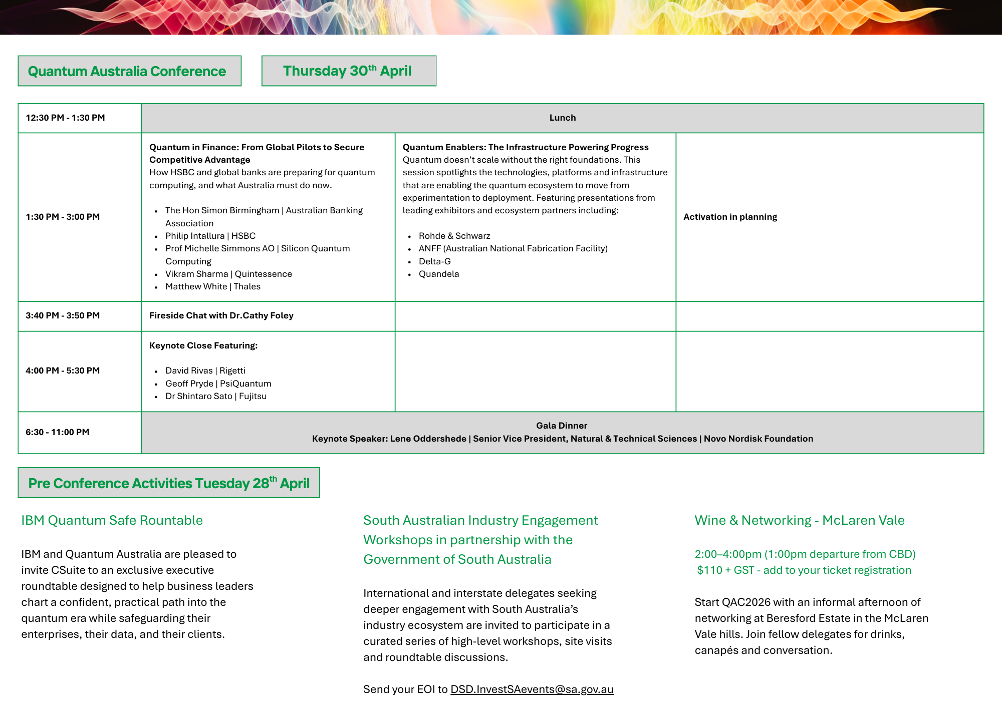Adelaide, South Australia, is a growing hub for defence, space, and advanced manufacturing, industries where quantum delivers measurable advantage.With the Australian Space Agency headquartered in Adelaide and significant investment in defence innovation, the state is a natural host for showcasing quantum’s role in sovereign capability, economic productivity, and commercial impact.Location
