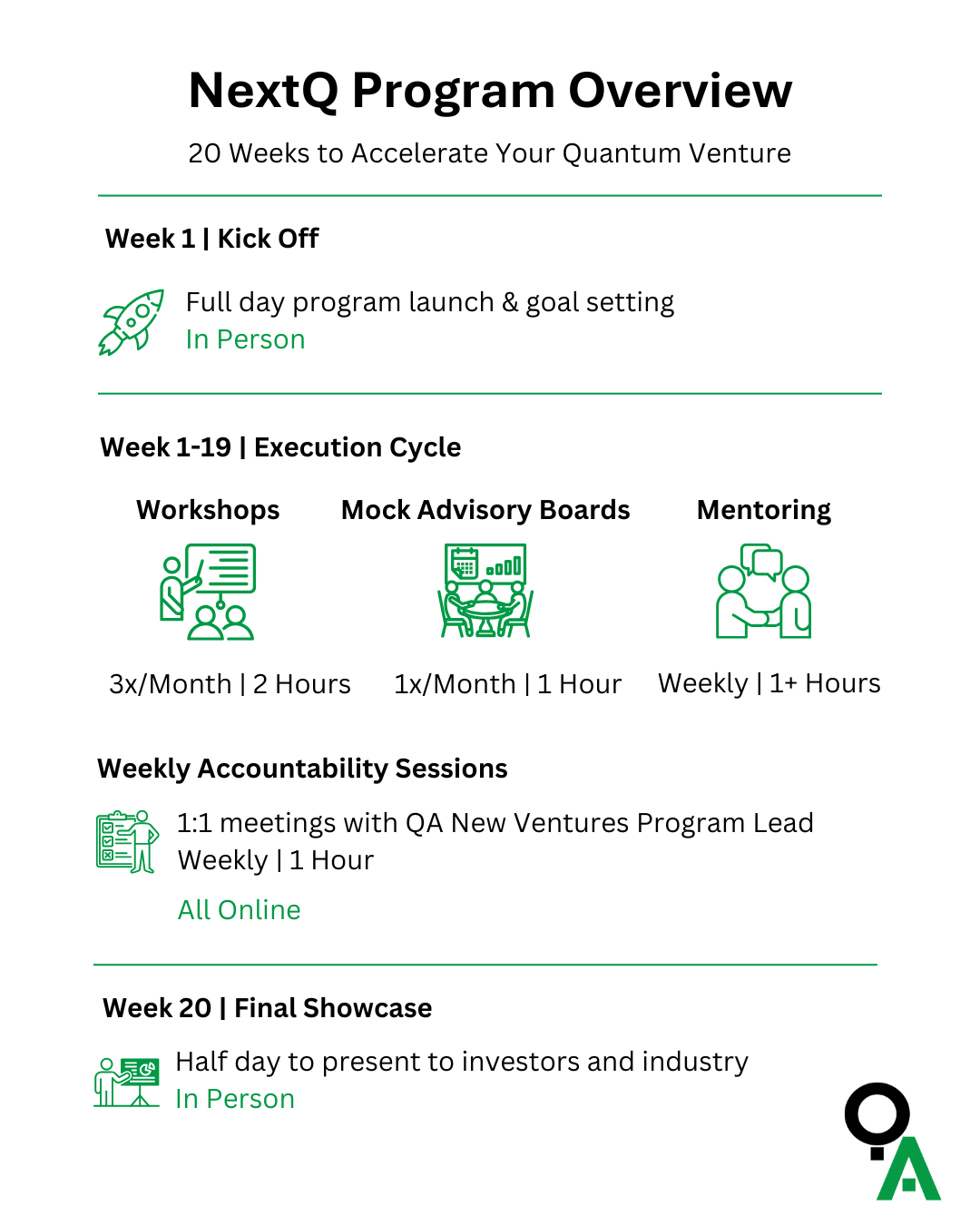 Across a structured 20-week startup accelerator, NextQ supports new quantum ventures, (incorporated for less than 18 months), in their transition from technical validation to commercial and investor readiness.